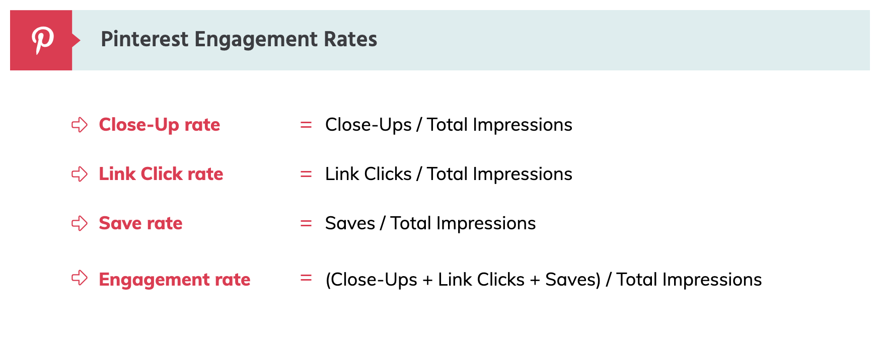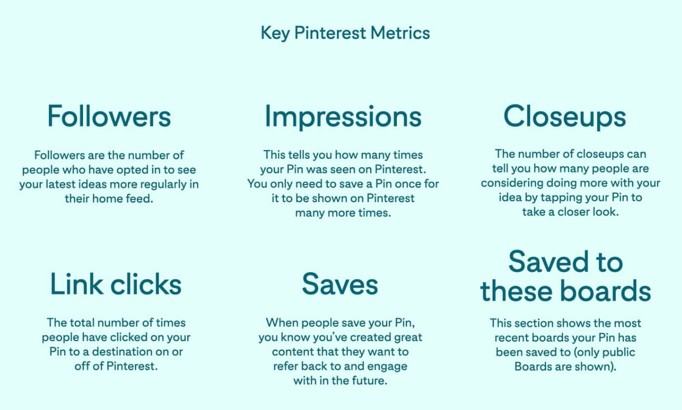월간 조회수 (Monthly Views)를 추적하는 대신 Pinterest Analytics에서 매달 웹사이트 데이터를 확인하는 것이 좋습니다. 핀터레스트에서 권장하는 다음의 주요 측정 항목들을 눈여겨 보시는 것에서부터 출발해보세요.