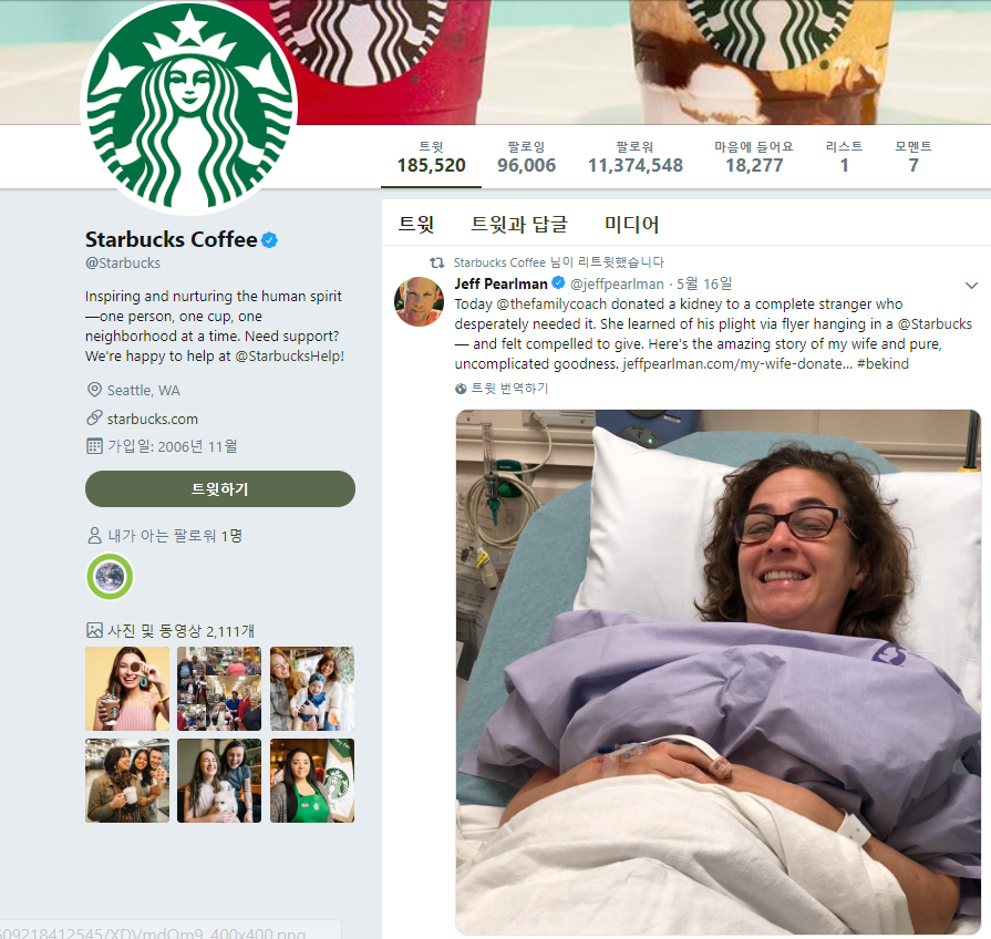 스타벅스는 트위터를 통해 고객의 이야기를 공유하는 것으로 유명합니다. 스타벅스 매장 안 전단지를 보고 생판 모르는 남자에게 신장 기부를 하게 된 사연처럼 감동적인 이야기를 공유함으로써, 스타벅스는 친근감을 높이고 공익적인 브랜드 이미지를 쌓아가고 있습니다.