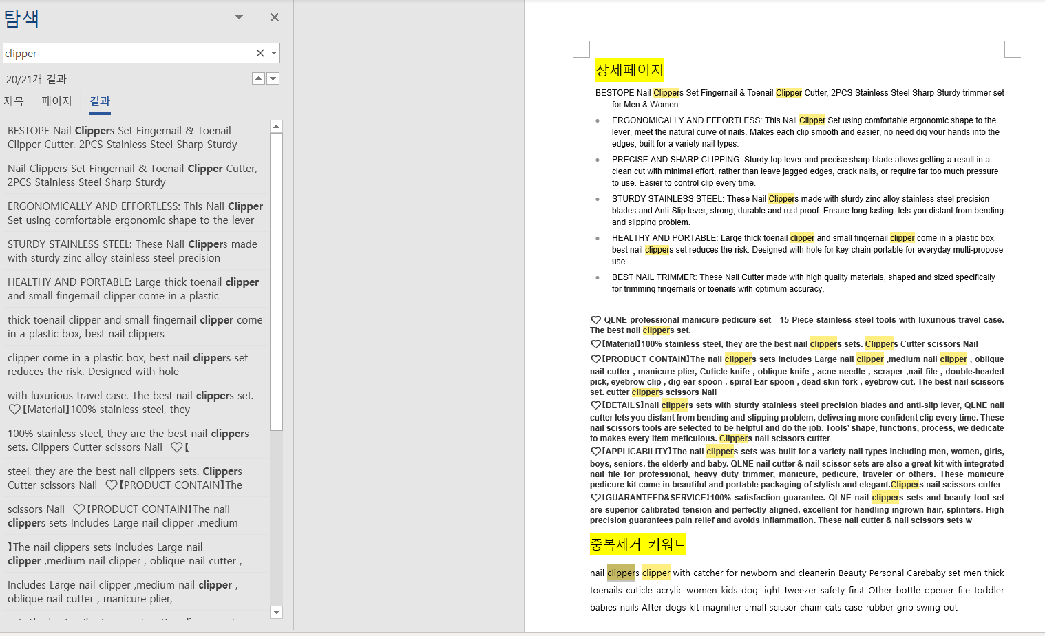 워드나 웹상에 상세페이지 내용과 중복 제거한 키워드를 붙여넣고 Ctrl+F키를 눌러 중복된 키워드를 한번 더 지워줍니다.