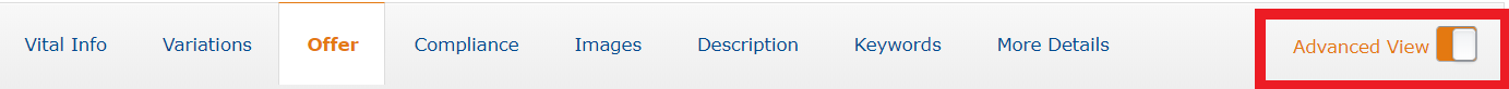 Keywords가 안보이시는 분들은 아마존 상세페이지 수정 메뉴바 오른쪽 Advance View를 눌러서 옵션을 켜주세요.