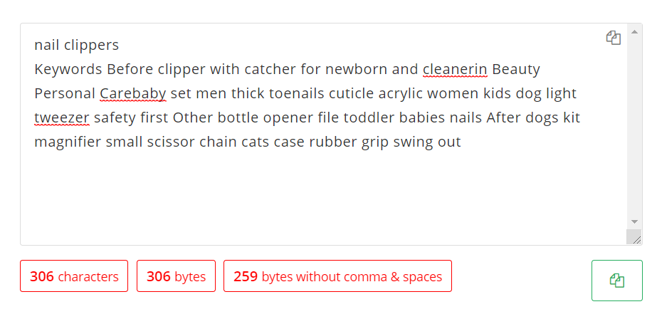 다시 아마존 중복 제거기로 돌아가 250바이트가 넘지 않는지 확인해 봅니다. 이렇게 해서 최종적으로 추출된 단어를 백엔드 키워드로 쓰게 됩니다. 만약 250자가 나오지 않는다면 핵심 키워드의 오타 버전과 스페인어 버전을 추가해 줍니다.