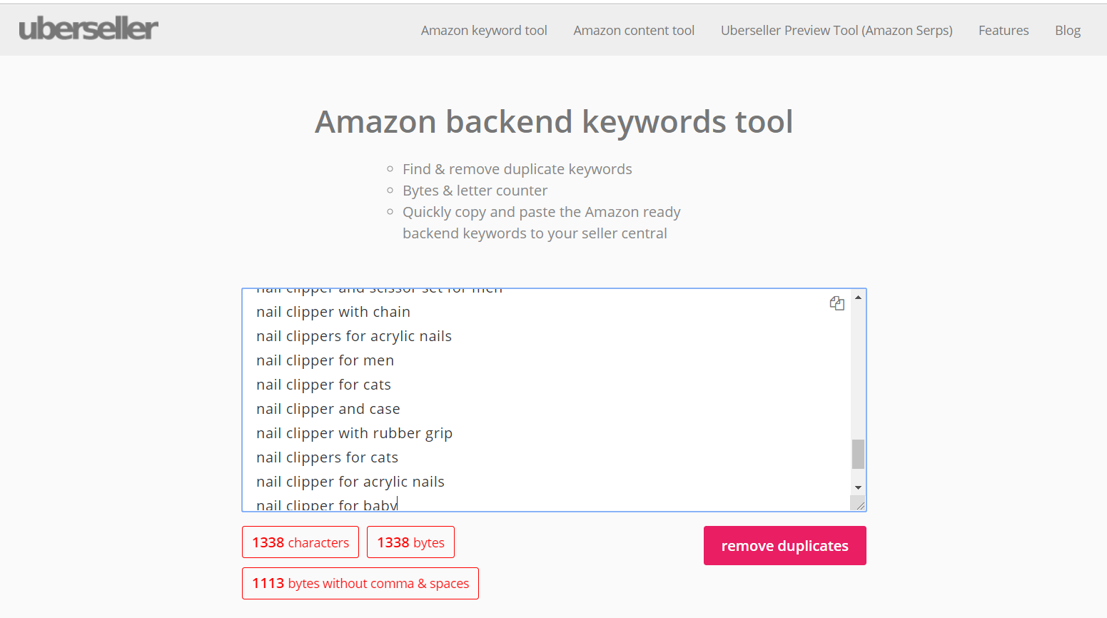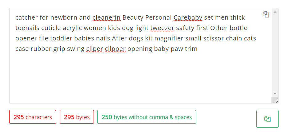 다시 아마존 중복 제거기로 돌아가 250바이트가 넘지 않는지 확인해 봅니다. 이렇게 해서 최종적으로 추출된 단어를 백엔드 키워드로 쓰게 됩니다. 만약 250자가 나오지 않는다면 핵심 키워드의 오타 버전과 스페인어 버전을 추가해 줍니다.