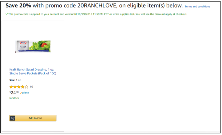 소셜 미디어 프로모션 코드가 승인되면 아마존에서 랜딩 페이지가 생성되어, 각종 소셜 미디어 채널에서 이 랜딩 페이지 URL을 사용할 수 있게 됩니다. URL은 오직 판매자의 세일만을 담고 있기 때문에 고객은 바이박스를 찾을 필요가 없이 바로 장바구니에 할인 중인 아이템을 추가할 수 있습니다. 할인은 결제 시 자동적으로 적용됩니다.