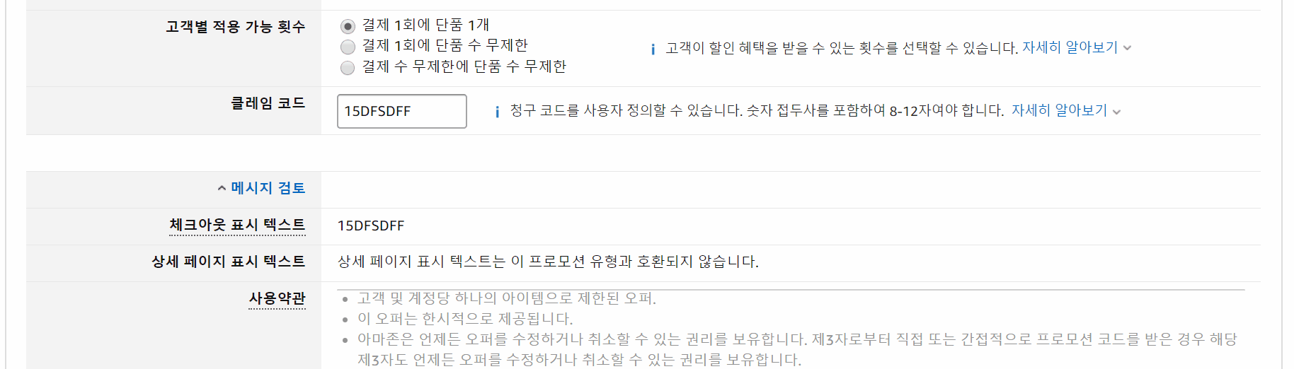 클레임 코드 유형 : 기본적으로 그룹으로 세팅되어 있으며, 수정 불가능합니다. 아마존에 따르면, 단체 클레임 코드(그룹)에는 수량 한도가 없습니다. 예를 들어, $10짜리 물건에 대한 50% 쿠폰을 생성했는데 1,000명이 사용할 경우 $500을 쿠폰 비용으로 소진하게 되는 것이나 마찬가지가 되는 것입니다. 단체 클레임 코드가 소셜 미디어 사이트에 게시되는 경우 전체 재고가 단기간에 소진될 수 있다는 점을 염두에 두어야 합니다.