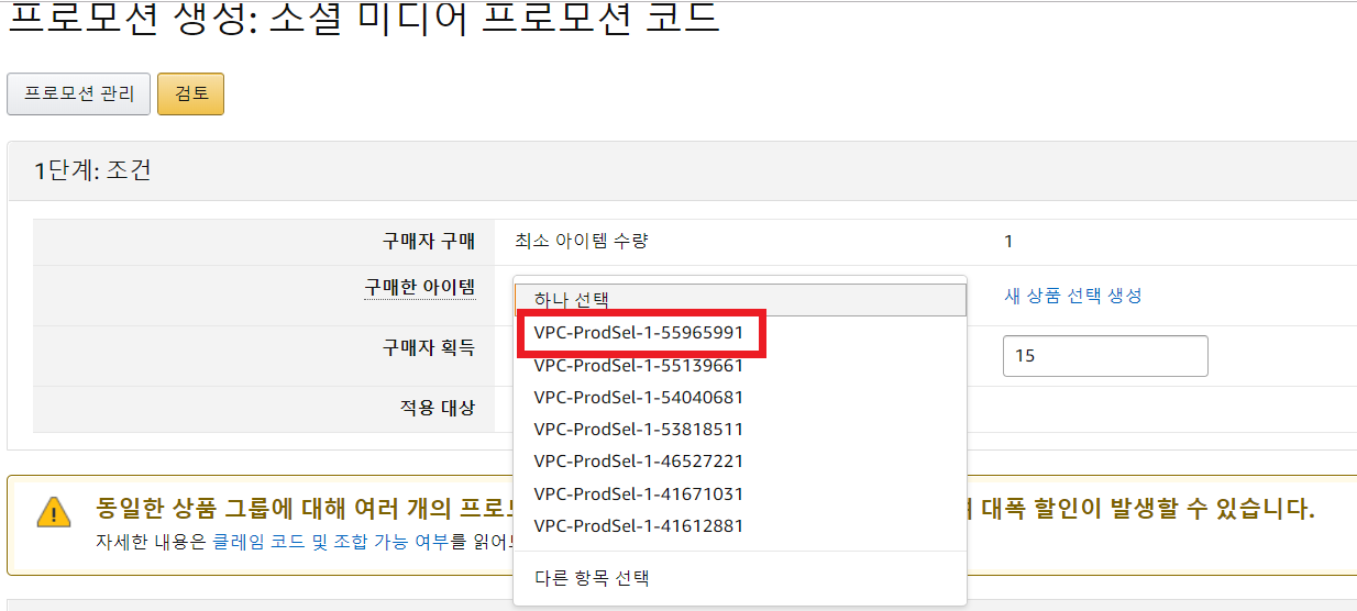 Step 4:프로모션 생성 소셜 미디어 프로모션 코드 페이지로 돌아와 구매한 아이템 드롭다운 메뉴에서 방금 만든 ASIN 리스트의 이름을 선택해 줍니다.