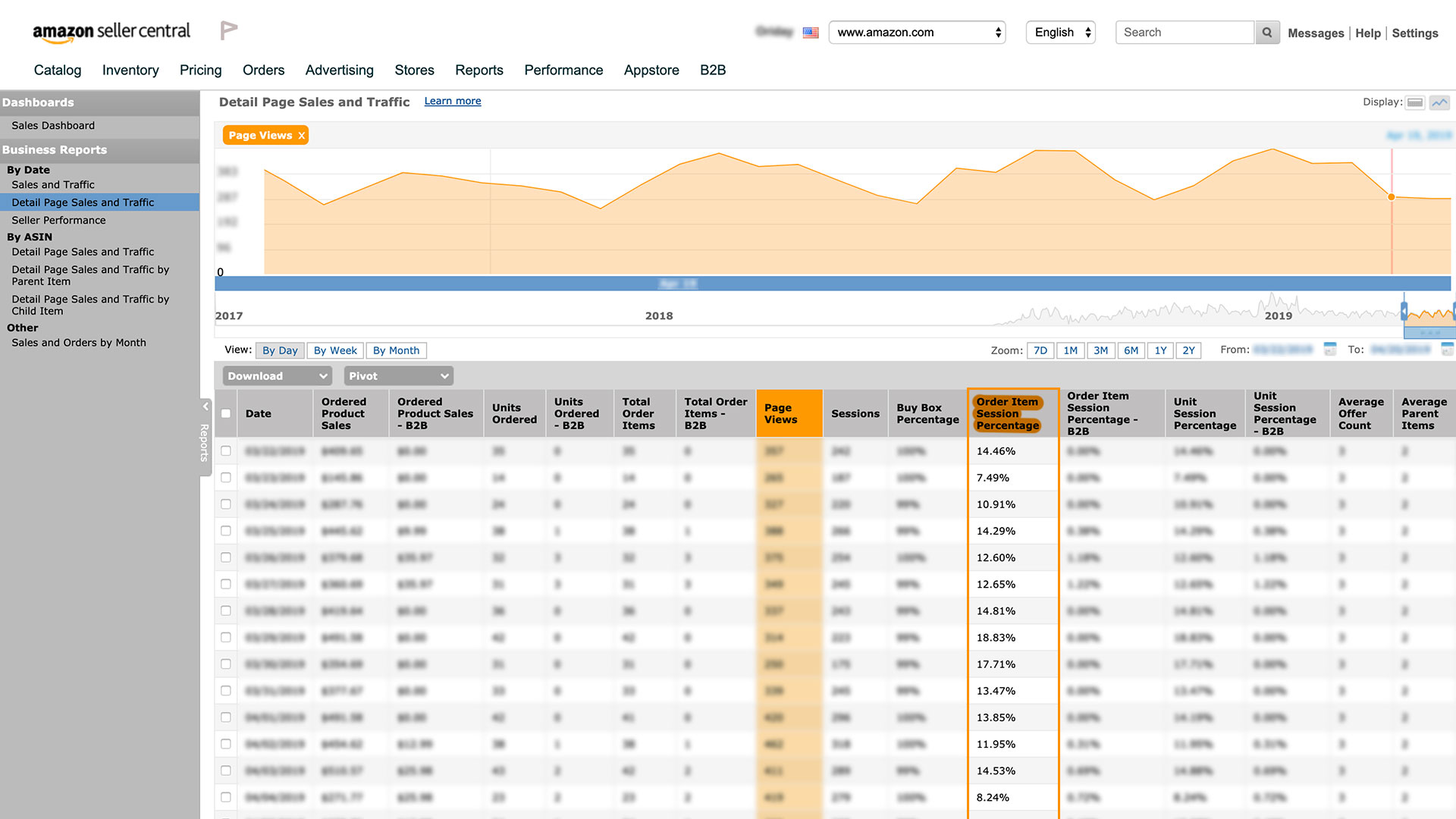 여기서 “Sales and Traffic”이라고 표현된 페이지내에서 전환율을 확인할 수 있습니다. 날짜별 또는 ASIN별로도 확인이 가능하죠.