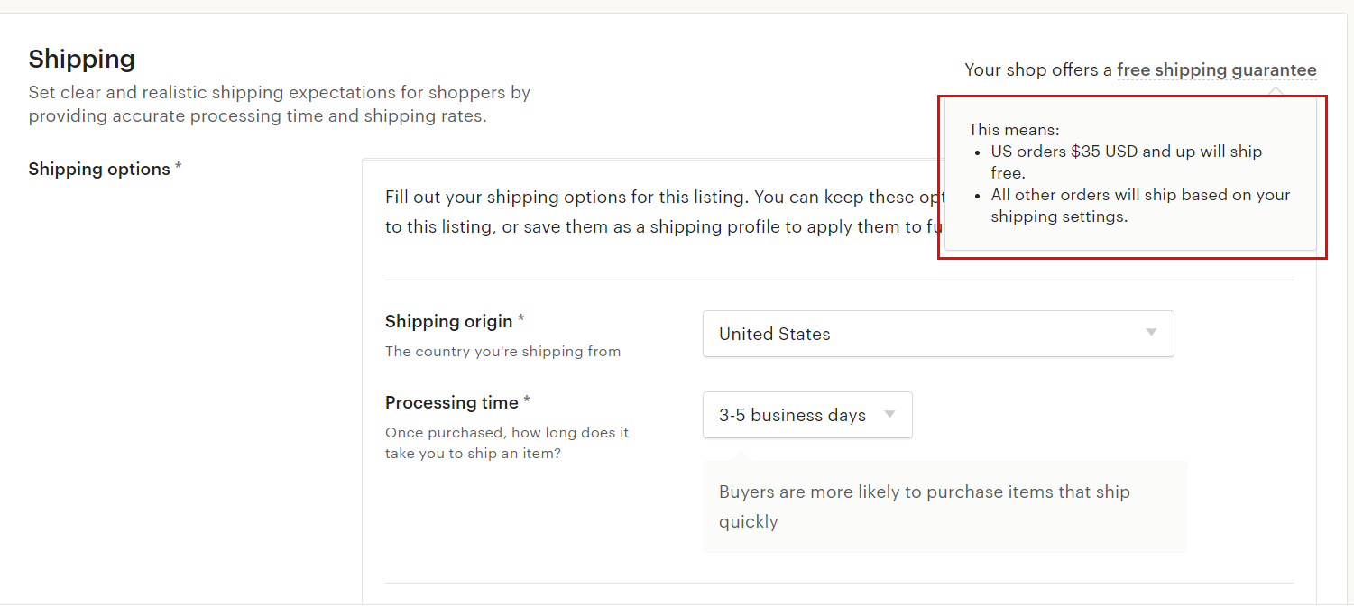 어쩌면 당연한 말이겠지만, 엣시의 조사 결과에 따르면, 엣시 구매자는 배송비를 구매 결정의 가장 중요한 요소로 꼽았다고 합니다. 2018년 3월의 설문조사에 따르면 배송비가 구매자가 경험한 이전의 가격보다 조금이라도 높아지면 구매 확률은 50% 낮아졌습니다. 2019년 7월 30일 미국 엣시에서 가장 노출이 많이 된 상위 자리는 미국 구매자에게 무료 배송(US free shipping guarantee)을 제공한 리스팅에게 돌아갔습니다.