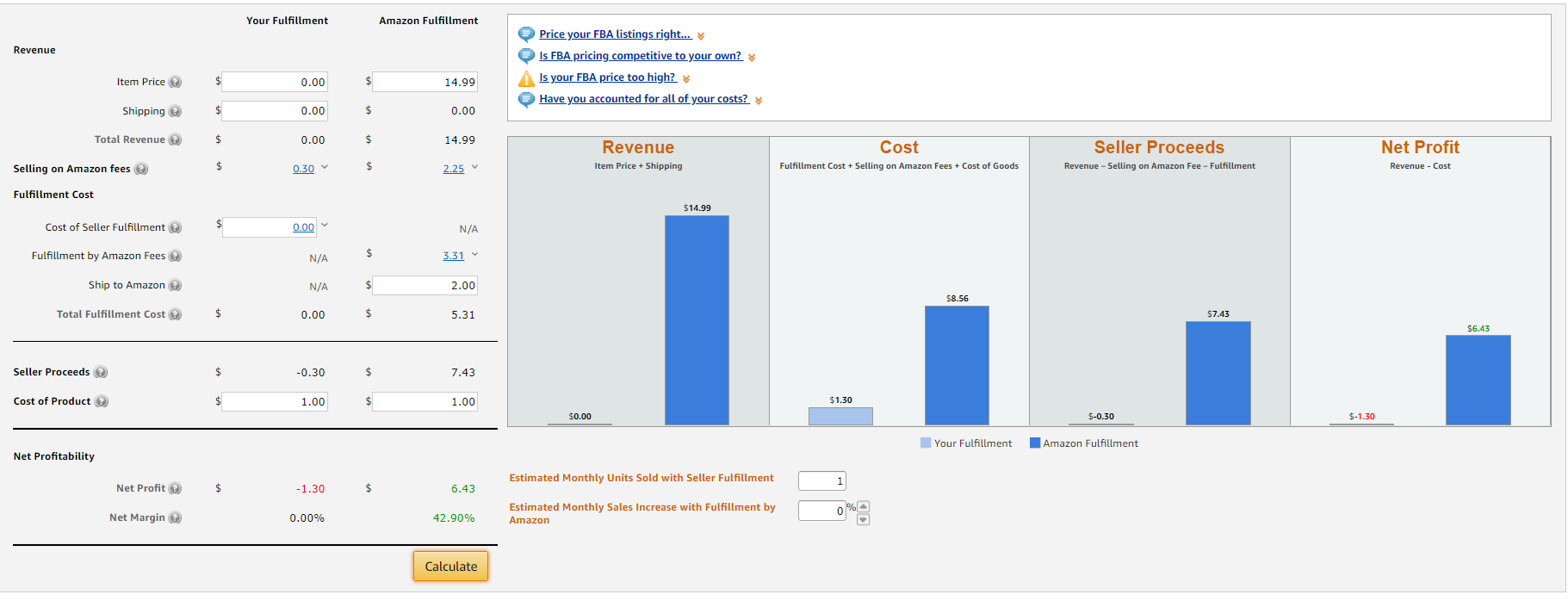 - Procurement cost는 조달 비용으로, 편의를 위해 원가와 FBA로 보내는 배송비를 포함하면 됩니다.