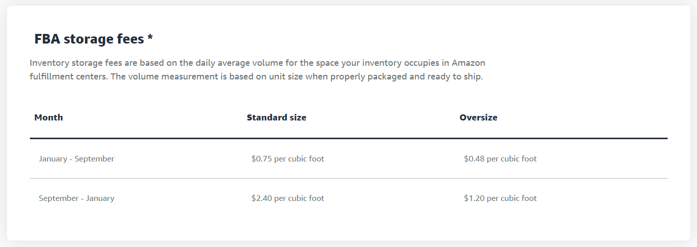 - 새로운 버전에는 월 창고 보관 수수료가 포함되지 않으나, 같은 페이지의 Storage fees에서 월별 창고 수수료를 볼 수 있어 따로 계산해볼 수 있습니다. 시즌에 따라 수수료가 달라지며, 9월-1월에 가격이 대폭 상승합니다. 부피에 따라 청구되므로 부피가 크면 재고 부담이 더 커집니다.