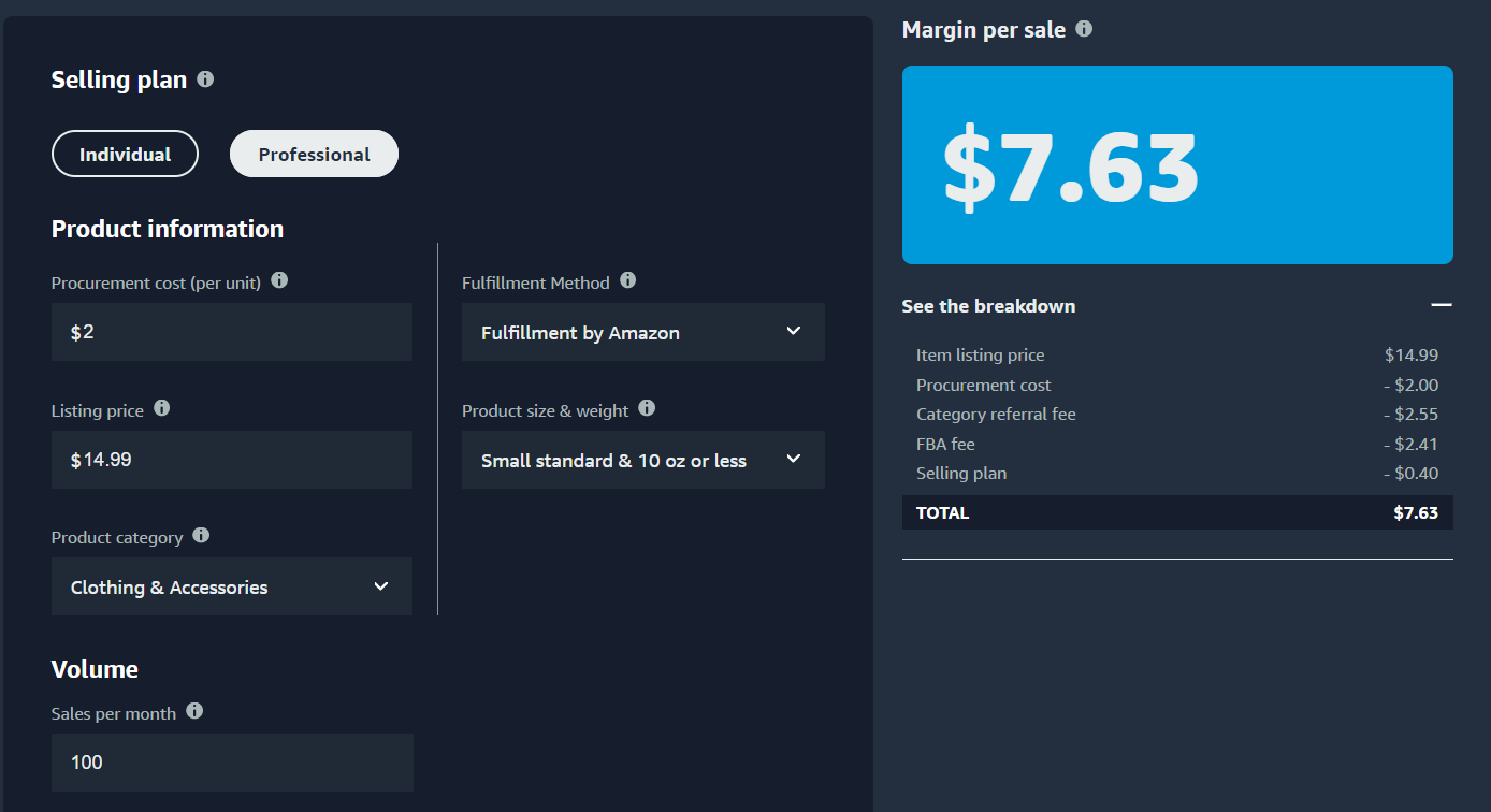 - 월 판매량(Volume)을 입력하면, Professional plan의 경우, $39.99에서 판매량만큼 나눈 금액이 Selling plan 비용이 됩니다. 판매량이 커진다면 미미한 금액이 되겠지요. Individual의 경우 Selling plan 비용은 $0.99가 됩니다.