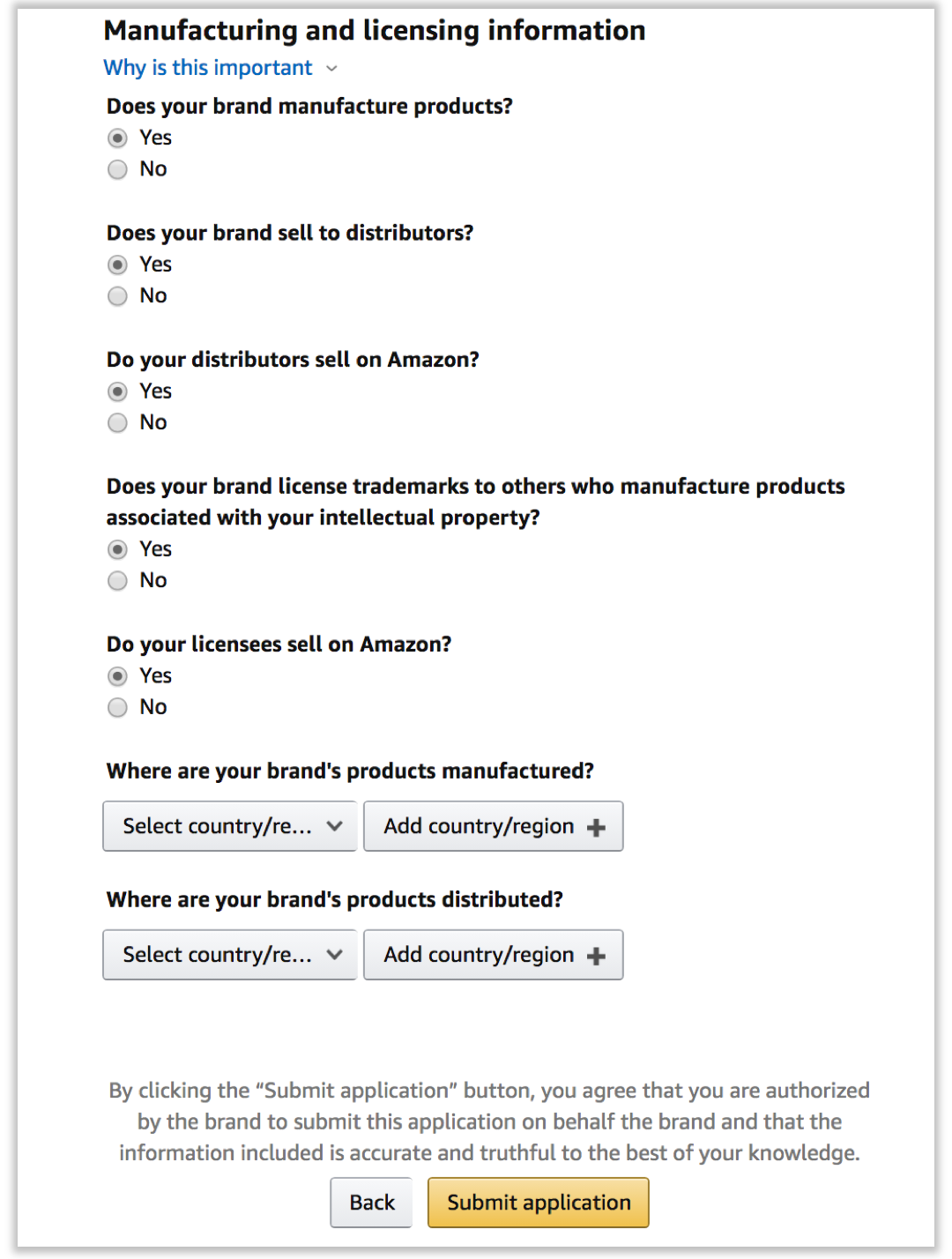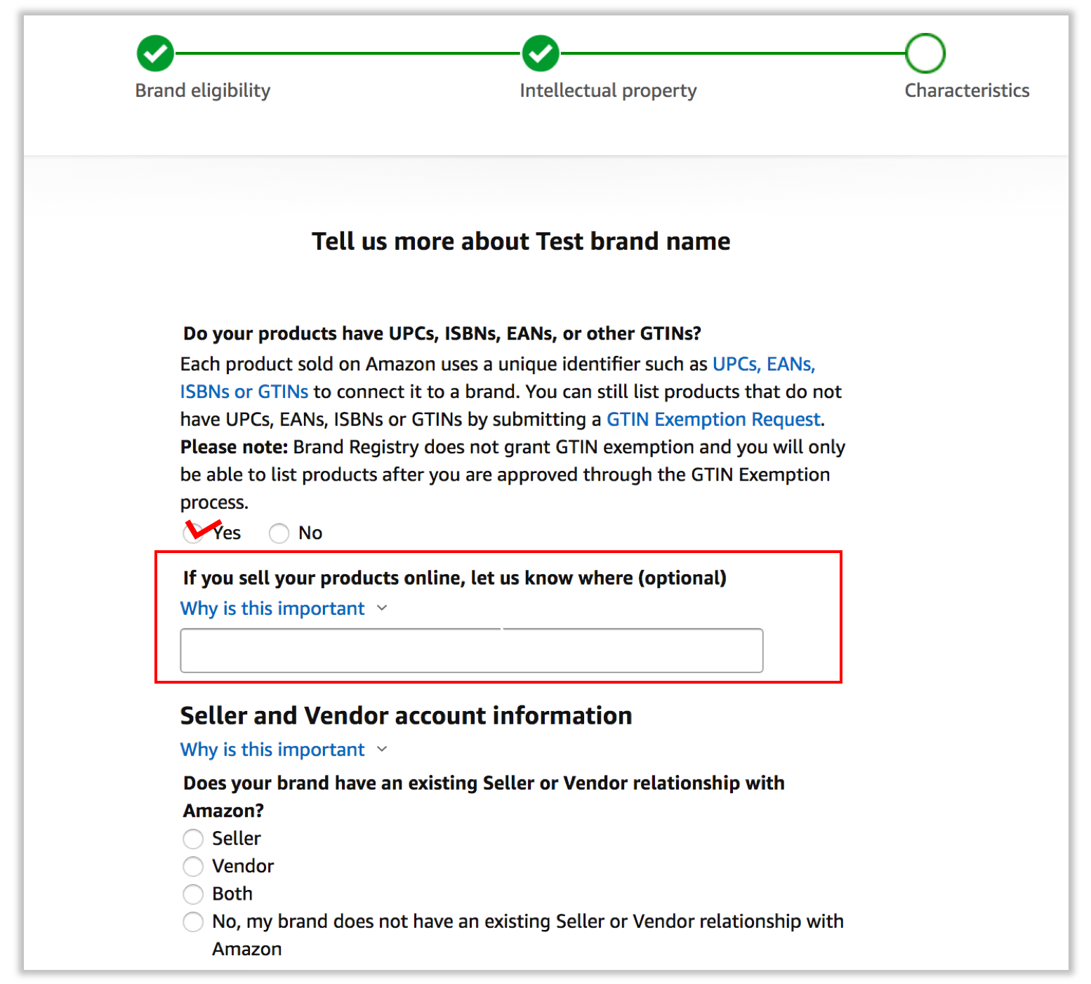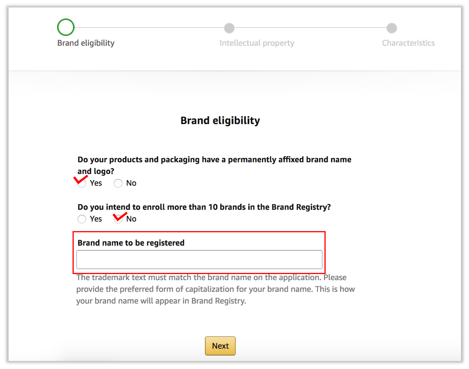 ① 제품이나 패키징 위에 영구적으로 귀속된 브랜드 로고가 있습니까? > Yes 선택. 패키지에 브랜드 이름이나 로고가 없다면 브랜드 등록을 진행할 수 없습니다.