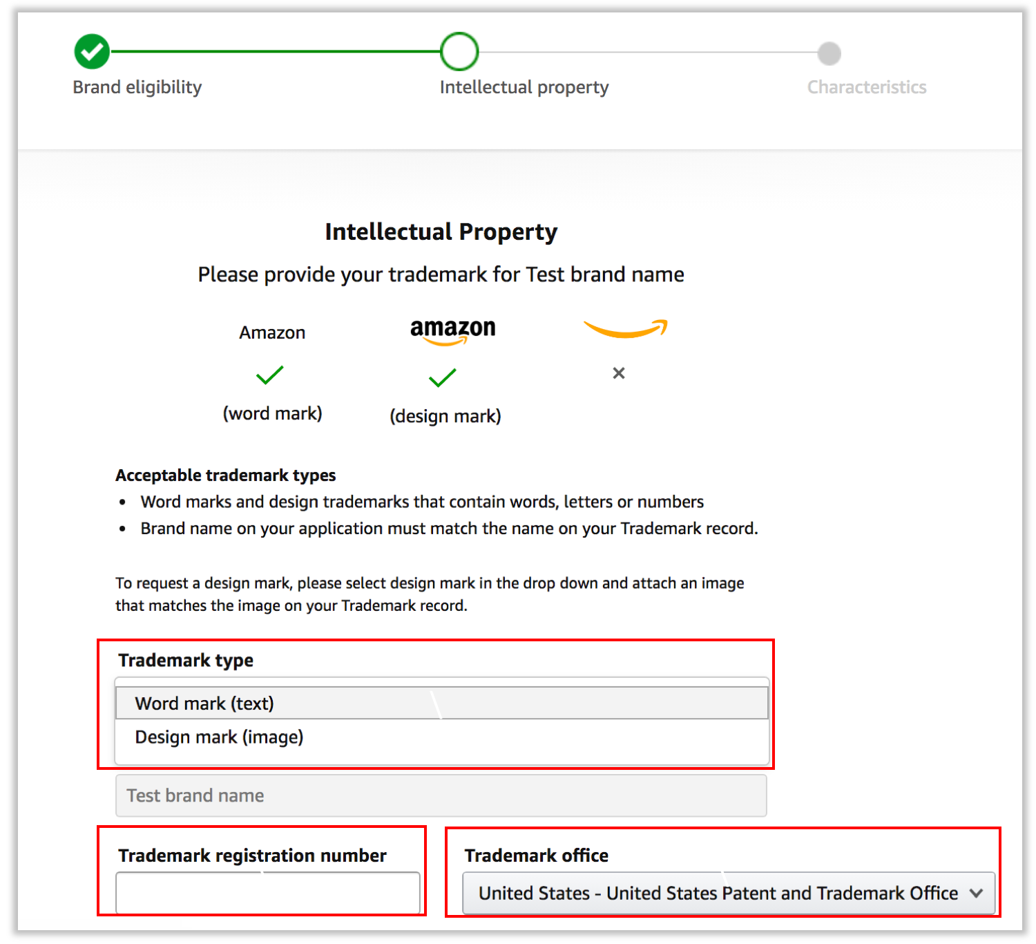 ③ 등록할 브랜드 이름 : 미국상표청(USPTO)에 등록된 브랜드 이름을 입력해 줍니다. 대소문자, 띄어쓰기 등 상표권에 등록된 것과 동일하게 입력합니다. 참고로 이 브랜드 이름은 상세페이지의 제목 아래에 파란색으로 나오게 됩니다.