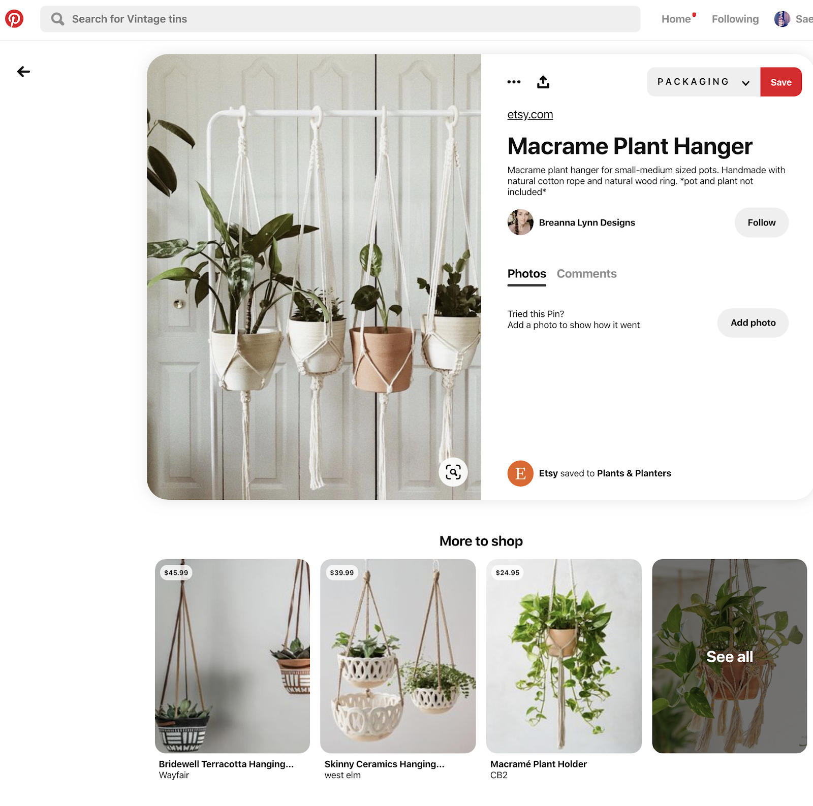 잠재적 구매자는 Etsy를 포함하여 여러 웹사이트에서 탐색하는 동안 자신이 마음에 드는 항목이나 사진 그림 등을 Pin it! 핀으로 저장하여 자신들의 영감을 얻기 위해 보드에 추가하거나 구매를 계획합니다. 이 핀은 다른 Pinterest 사용자가 다시 자신의 보드에 저장할 수 있기 때문에 사용자들끼리 스스로 노출을 증가시키며, 다른 돈을 투자하지 않아도 빠른 시일 내에 광고효과를 기대할 수 있습니다.