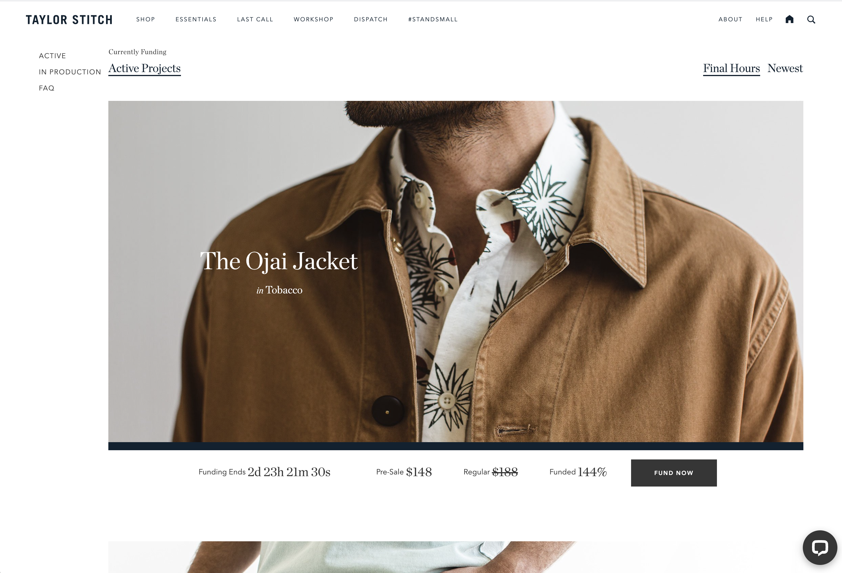 테일러 스티치는 매달 자체 크라우드펀딩 시스템을 통해 신제품을 런칭합니다. 펀딩은 4주동안 이루어지며, 소비자들은 Pre-order 개념으로 펀딩기간 동안 제품을 구매하게 됩니다.