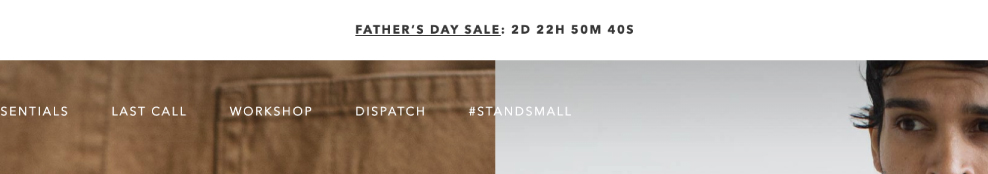 상단에 항상 따라다니는 한줄짜리 메시지바 많이들 보셨을 거라 생각합니다. 이를 어나운스먼트바 (Announcement Bar)라고 칭합니다. 문자 그대로 프로모션이나 공지메세지 등을 띄우는 공간입니다. 테일러 스티치의 경우 이 어나운스먼트 바를 흥미롭게 활용하고 있었는데요, 세일 기간 중에는 타이머 기능을 넣어 세일 기간이 얼만큼 남았는지 보여줍니다. 이런 시간적인 압박을 주는 것도 소비자의 구매를 유발하는 하나의 마케팅 요소이죠.