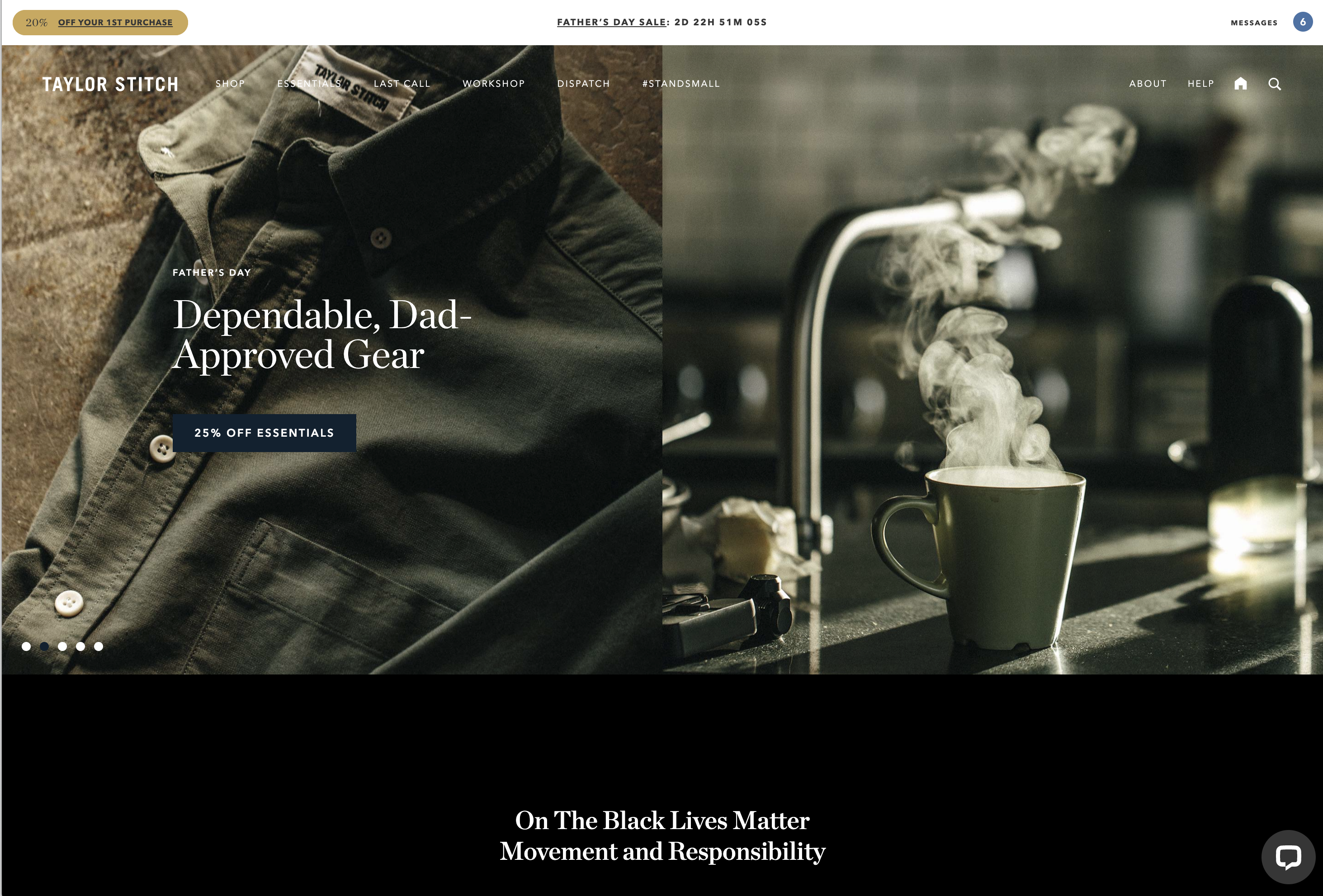 테일러 스티치의 랜딩페이지 디자인은 크게 색다를 것은 없습니다. 하지만 라이프스타일 브랜드답게 분위기 있는 고퀄리티의 사진들로 먼저 시선을 사로잡습니다. 그리고 다양하지만 간결하고 직관적인 CTA들을 사용함으로써 고객들의 반응을 이끌어내고 있습니다. 단순히 Shop Now 를 반복하지 않고 할인율을 보여주는 숫자를 노출하거나 Fund Now 등 다른 단어를 사용함으로써 고객들이 흥미를 느낄 수 있도록 유도합니다.