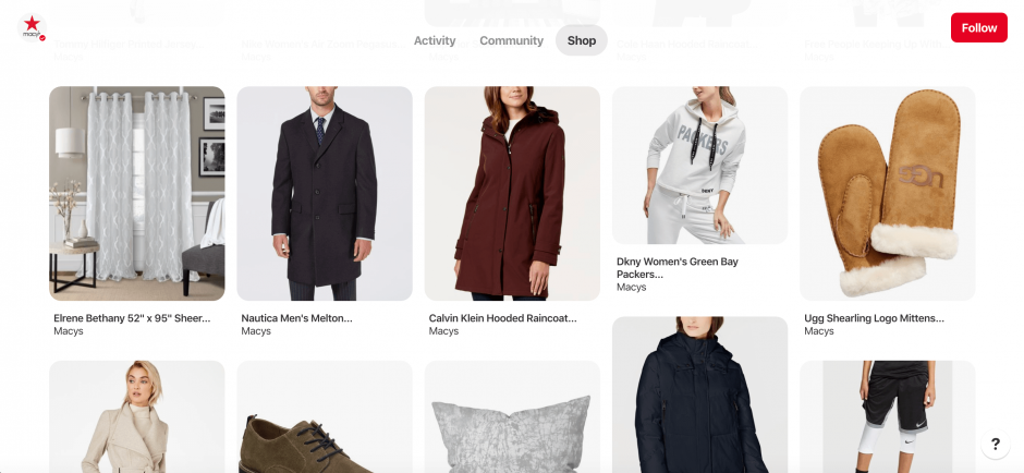 핀터레스트는 최근 비즈니스 계정 사용자들을 위한 쇼핑 탭도 도입했습니다. 이 전용 탭을 통해 사람들은 브랜드의 프로필에서 바로 제품들을 쇼핑할 수 있습니다.