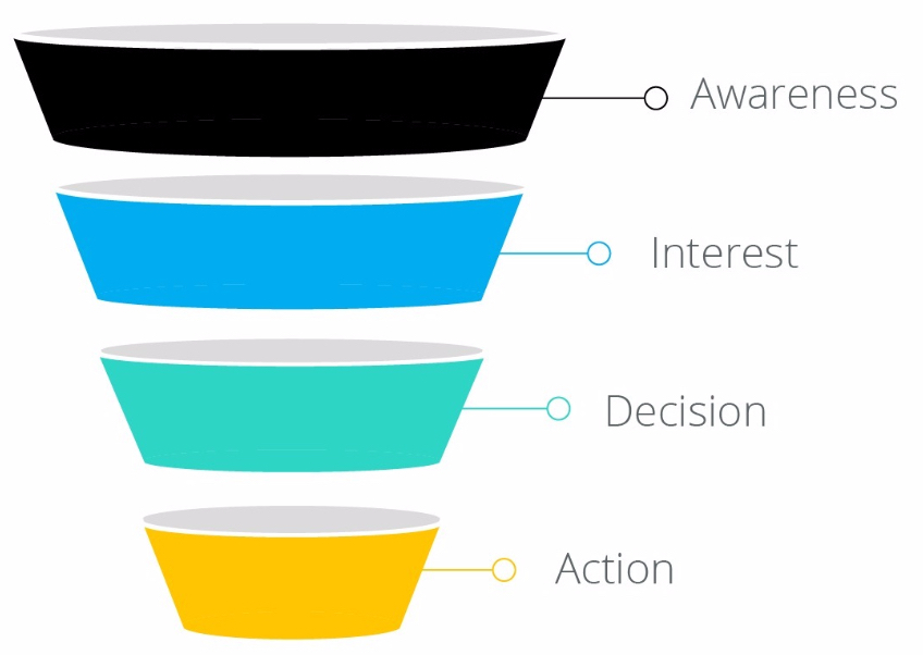 일차적으로 노출을 시키는 것이 중요하지만 그에 좋은 콘텐츠 전략이 뒷받침되어야 합니다. 마케팅전략에서 많이 볼 수 있는 마케팅퍼널이 여기에서도 적용이 되는 것이죠. 인식(Awareness) > 관심(Interest) > 결정(Decision) > 행동(Action) 의 단계로 소비자를 이끄는 전략을 구축해야 합니다.