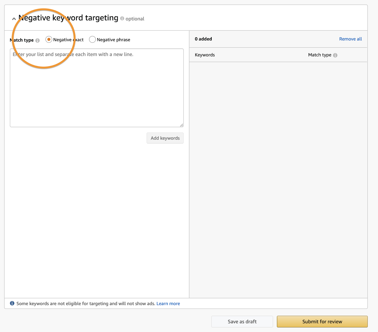 -다른 매뉴얼, 오토 캠페인을 이미 사용해보신 광고주분들은 자신의 제품과 맞지 않고, 연관성이 없는 키워드에 대해 이미 파악이 되셨을 경우 네거티브 키워드 설정을 통하여 보다 효과적인 광고로 셋업 하는 것을 추천드립니다.