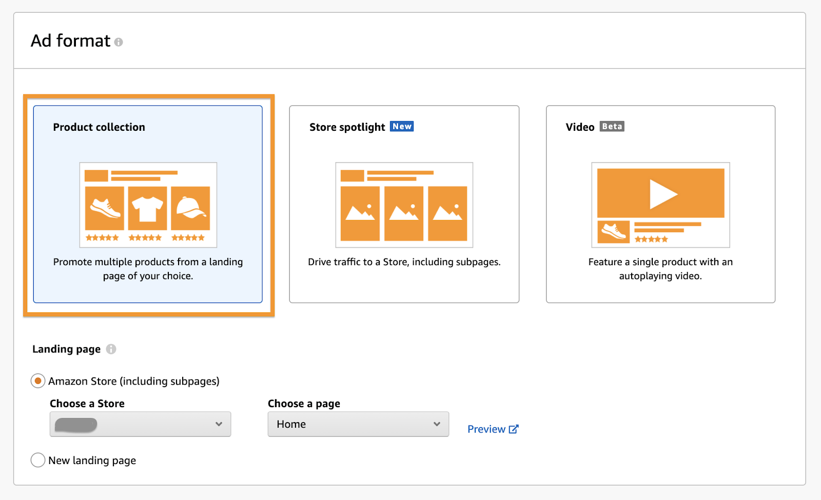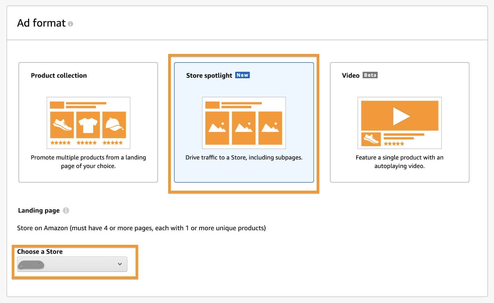 2. 캠페인 형식 설정 : 스토어 스팟라이트 (Store Spotlight) ㄱ. 아마존 스토어 연결(Amazon Store) : 셀러분의 스토어로 연결하여 전체 카테고리 제품을 노출시킴