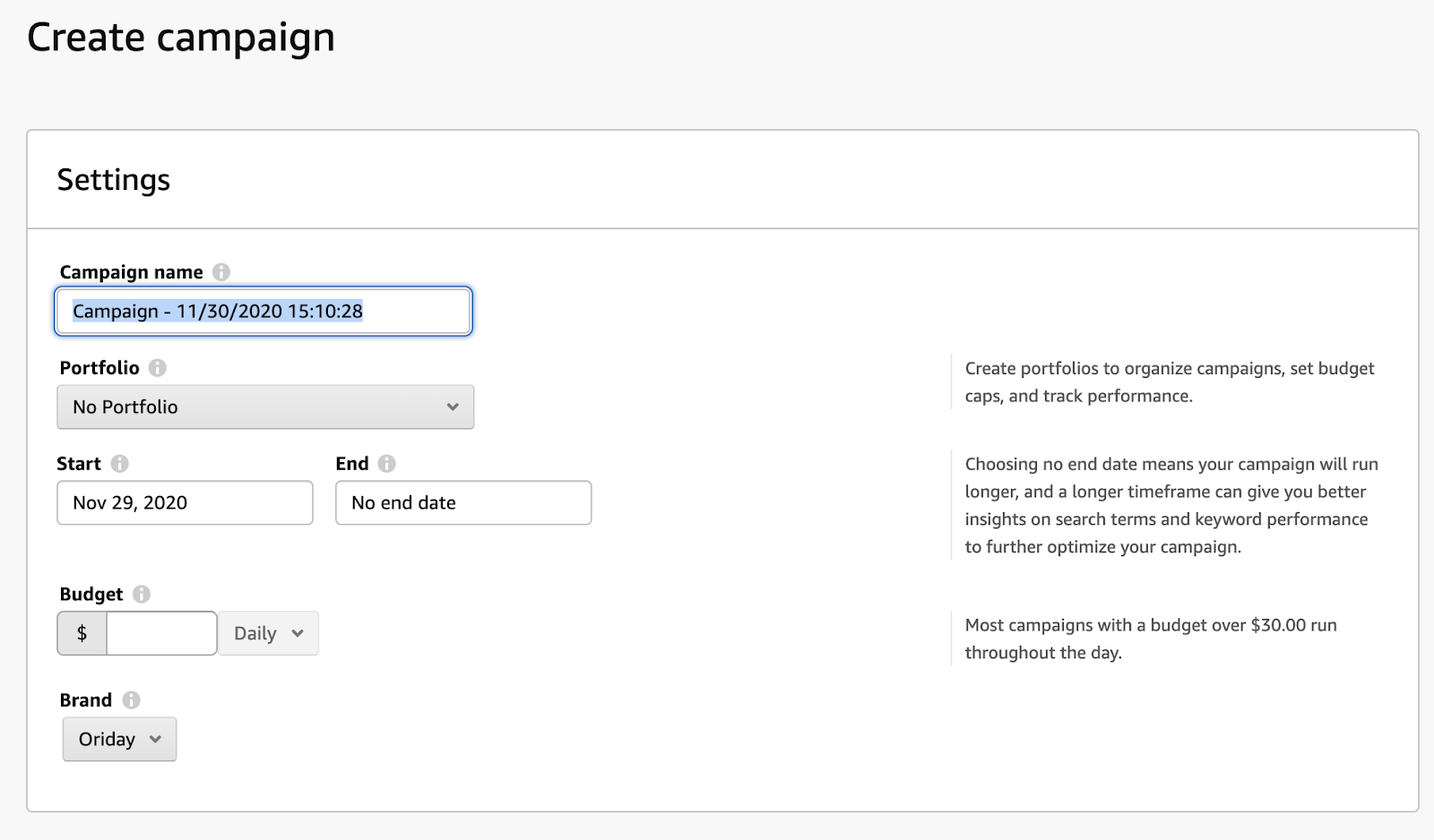 대부분의 경우, 광고 종료일 (End date)은 지정하지 않으며, 추후 원하는 경우 직접 캠페인을 정지시킴
